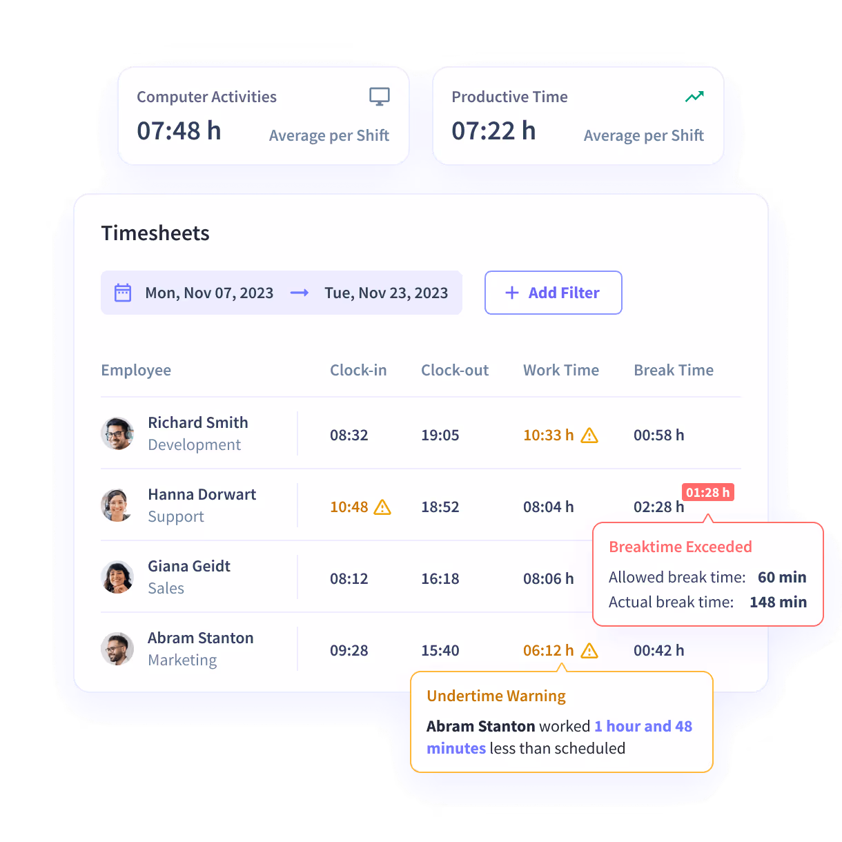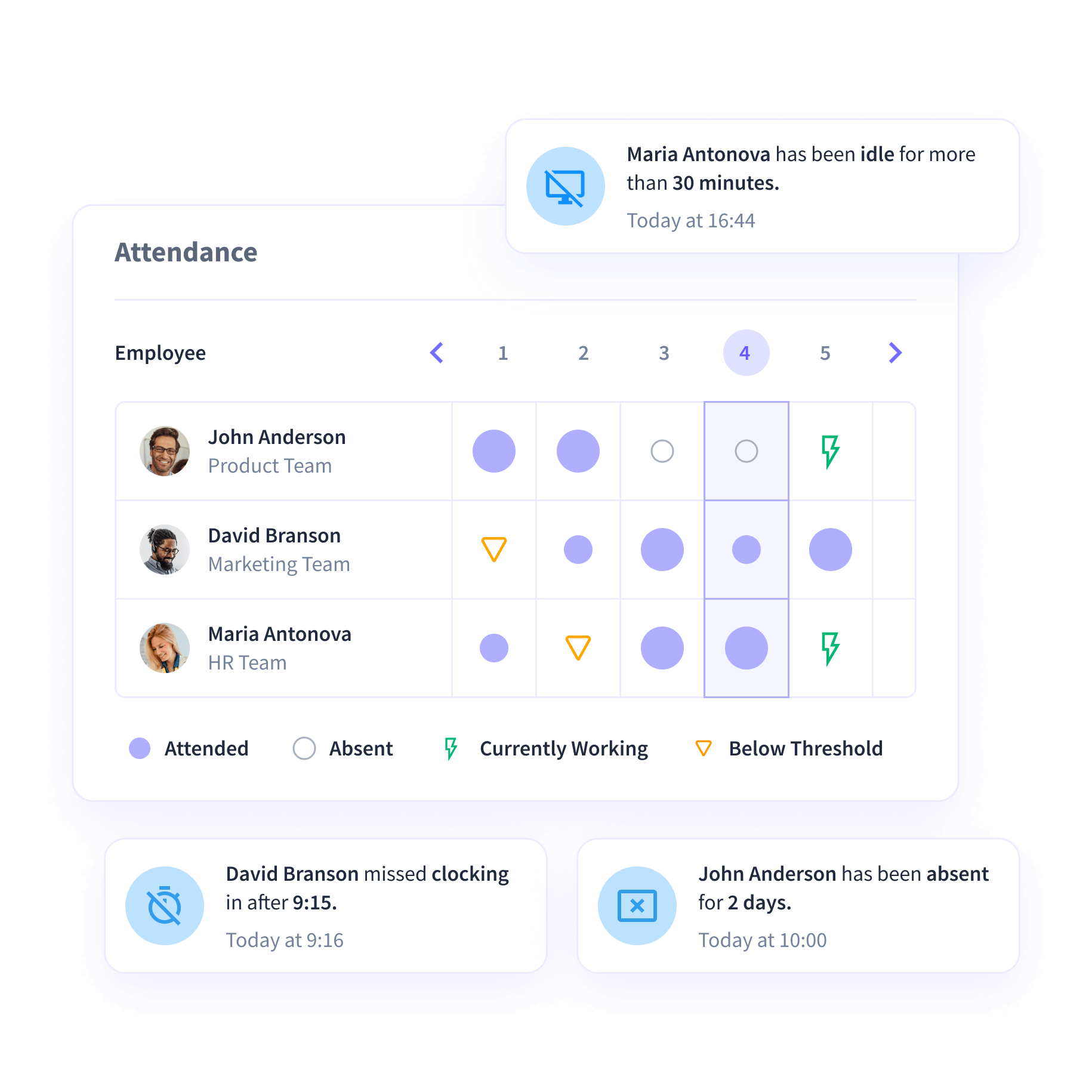 Receive notifications when an employee arrives late, misses a clock-in, takes prolonged breaks, or is absent from work.