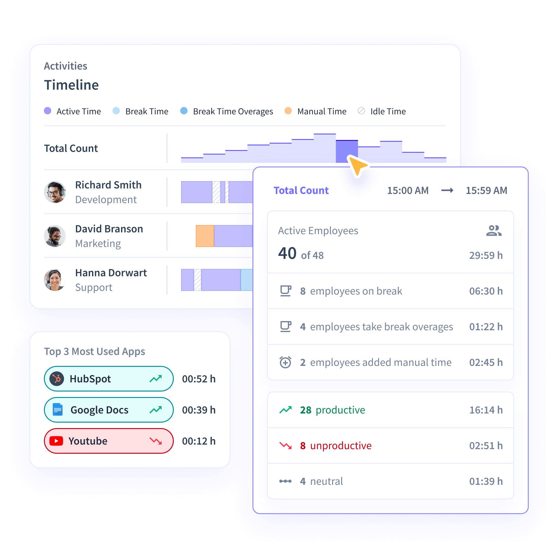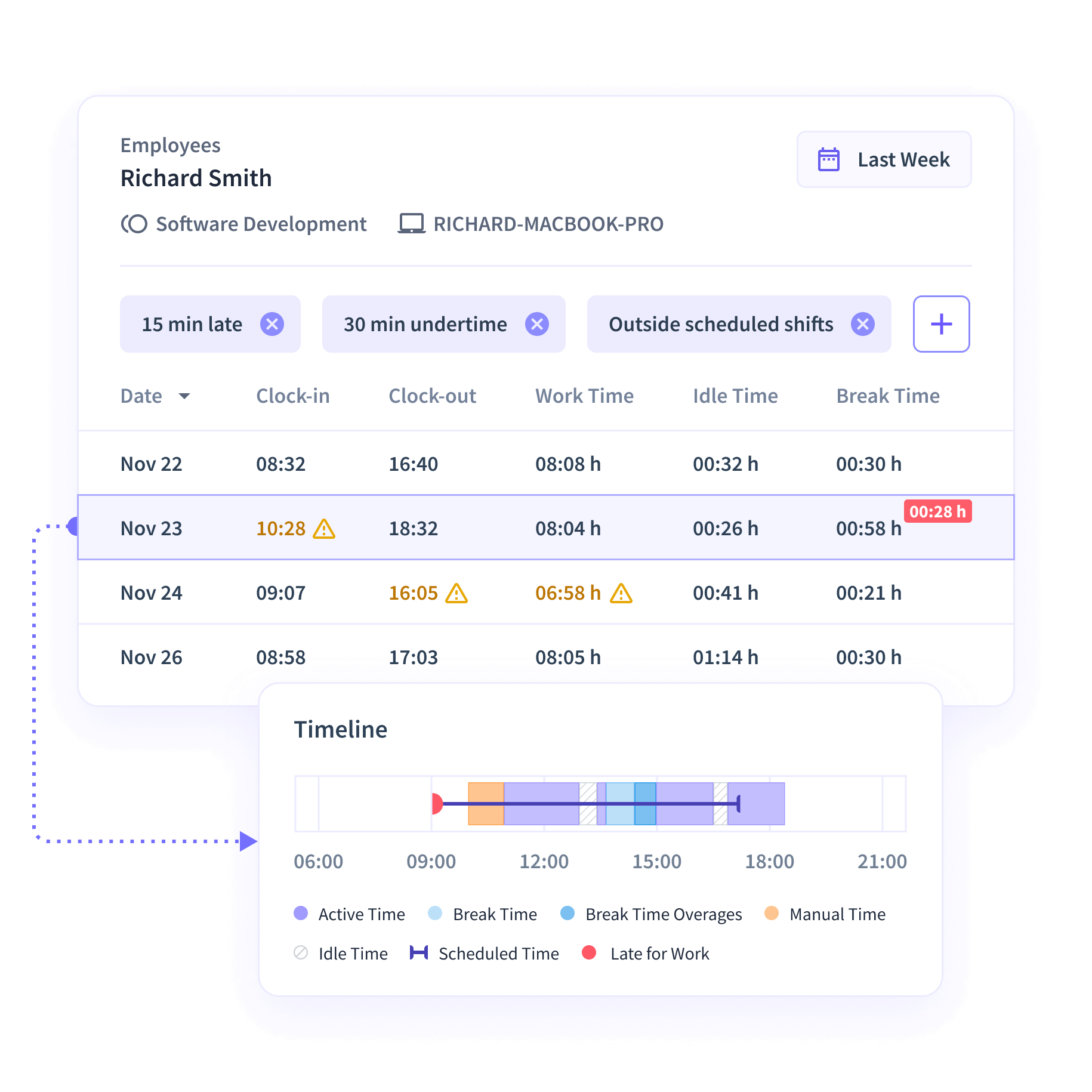 Insightful lets you manage computer-based time and attendance, so you can track employee work hours, gain clear visibility into attendance, and see how time is allocated to boost productivity.