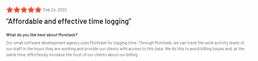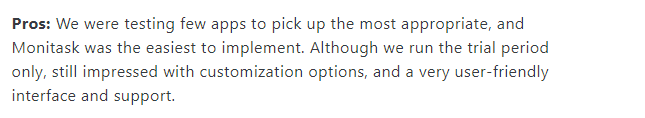 On G2, users commend Monitask for its pricing, among other features such as ease of use, admin dashboard, setup, and overview capabilities. However, there have been mentions of occasional difficulties starting tasks, pausing the application, and a perceived lack of certain integrations and payment options.