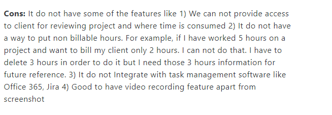 Some users on G2 reviews expressed a desire for features that support non-directly billable hours and integration with third-party software: