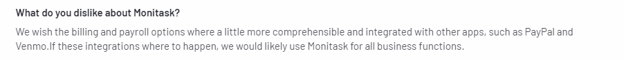 The FinancesOnline reviews affirm Monitask's accuracy and effectiveness for performance tracking. Nevertheless, there have been mentions of challenges with running Monitask on Linux OS and a call for additional features, including non-billable options, better support for other tools, screen recording, and payroll system integration.