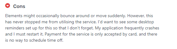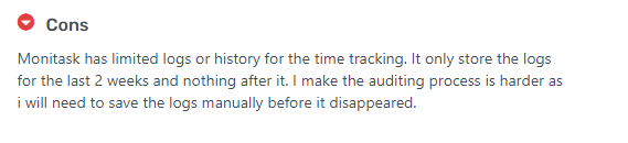 One of the negative aspects of Monitask mentioned in GetApp reviews is related to data management upon terminating the service. Users have reported that stopping the service results in data loss as the software does not provide a way to download the data. Also, there have been concerns raised about inconsistent timing and occasional interruptions in time tracking during work: