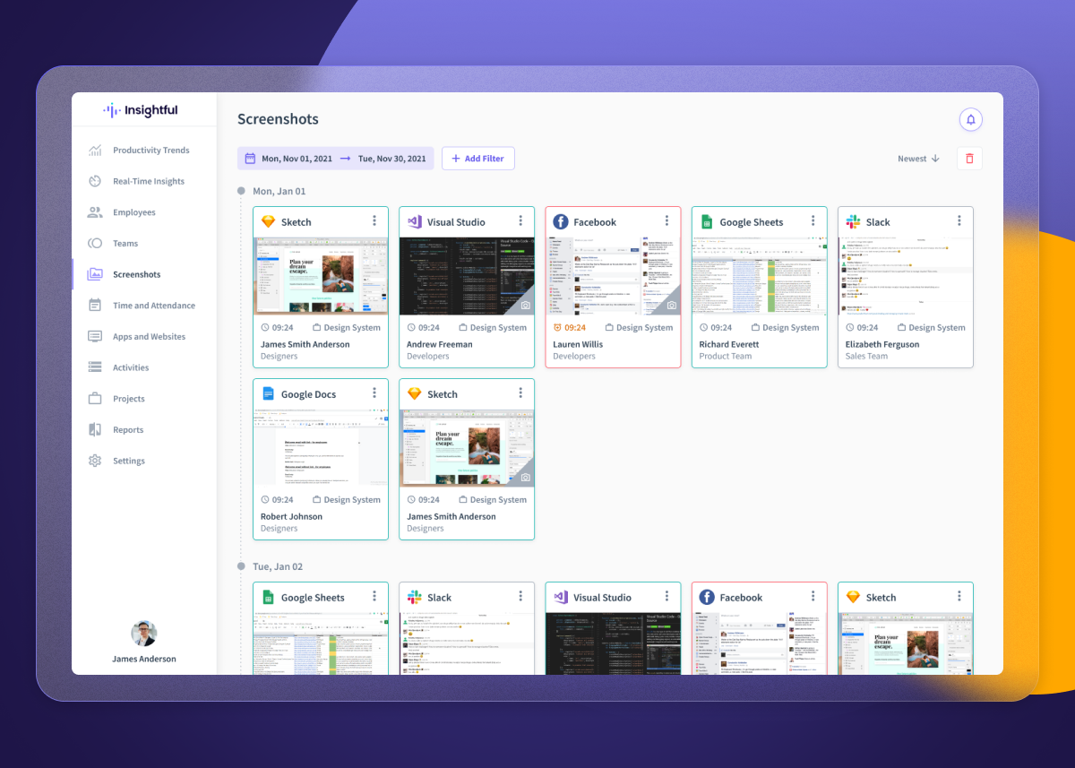 For companies operating across diverse geographical locations and time zones, managing absent days and punctual clock-ins can be challenging. Insightful's employee tracker helps:
