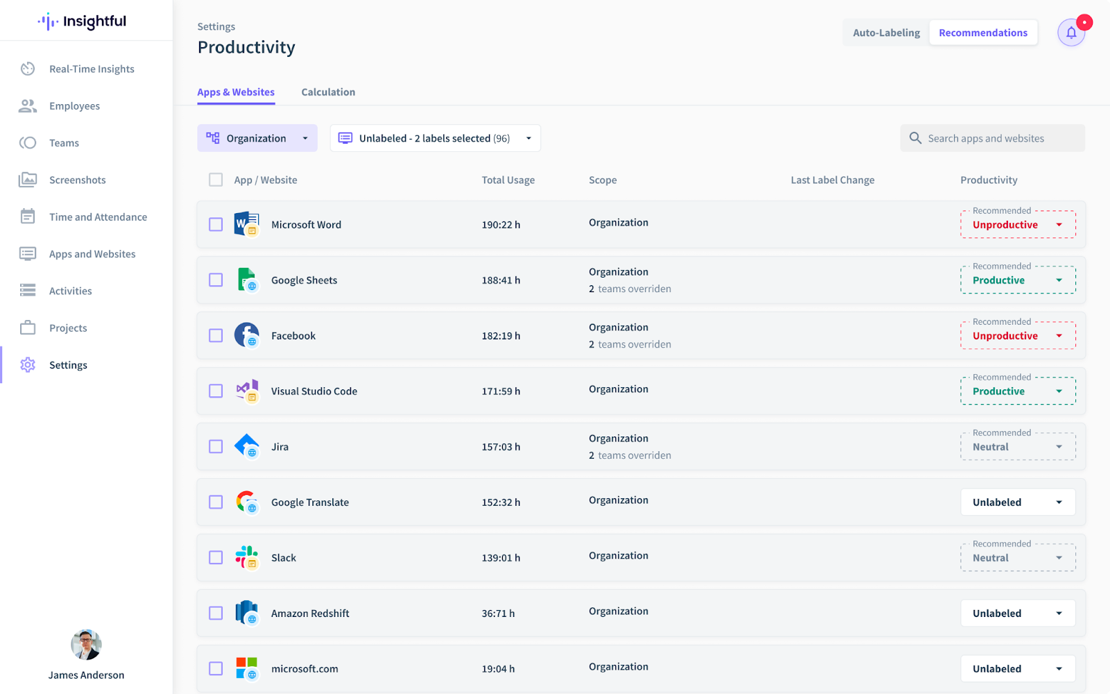 We only provide label recommendations for unlabeled apps and websites. Insightful will never override labels that clients have already applied.