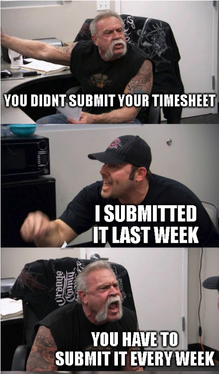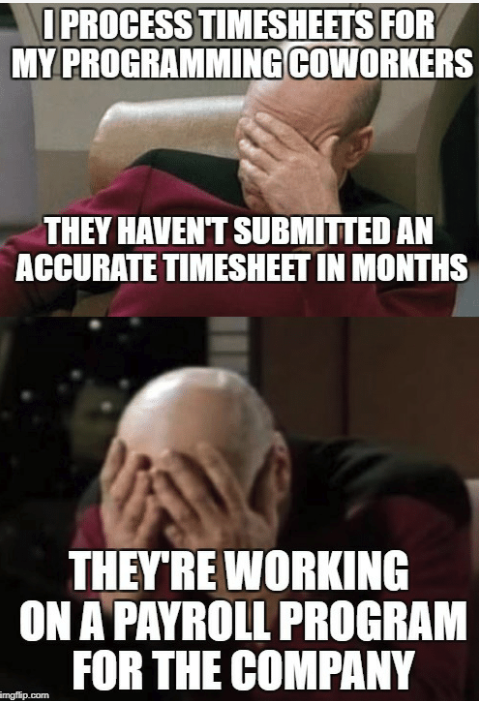 Lograr que los empleados envíen las hojas de horas de manera precisa y puntual es un desafío familiar para los empleadores. Este emotivo meme es algo con lo que todos los gerentes pueden identificarse. ¿Tu programador estrella que puede escribir código como una máquina? Parece que todavía no puedo enviar una hoja de tiempo correcta.