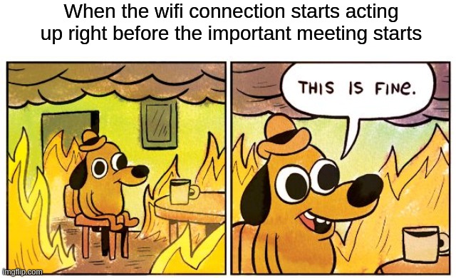 Ley de Murphy: El Wi-Fi nunca falla... excepto cuando más lo necesitas. Justo cuando estás a punto de compartir una diapositiva crucial:puf—tu conexión se interrumpe. Este meme sobre el trabajo desde casa refleja el temor absoluto de que una reunión se estropee, gracias a un impredecible servicio de Internet. Los gerentes saben muy bien que los gremlins de la tecnología parecen tener una sincronización impecable.
