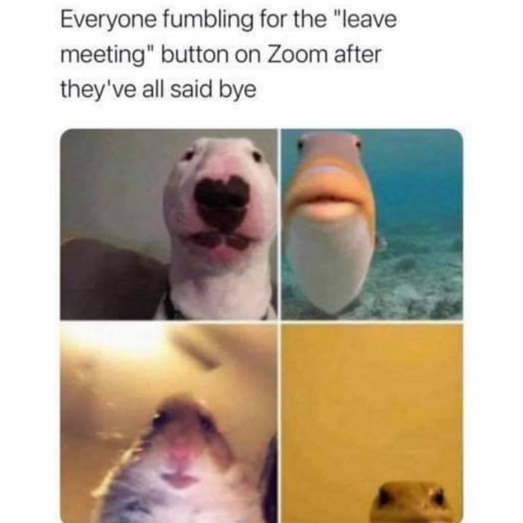 Incluso después de sobrevivir al caos de las reuniones, está el definitivo desafío: abandonar la llamada. De alguna manera, el simple hecho de pulsar «Salir de la reunión» se convierte en un juego sincronizado de buscar la salida a tientas. Nuestros amigos animales de este meme lo ilustran perfectamente: todo el mundo se queda con torpeza, sin saber cuándo es seguro hacer clic en él.