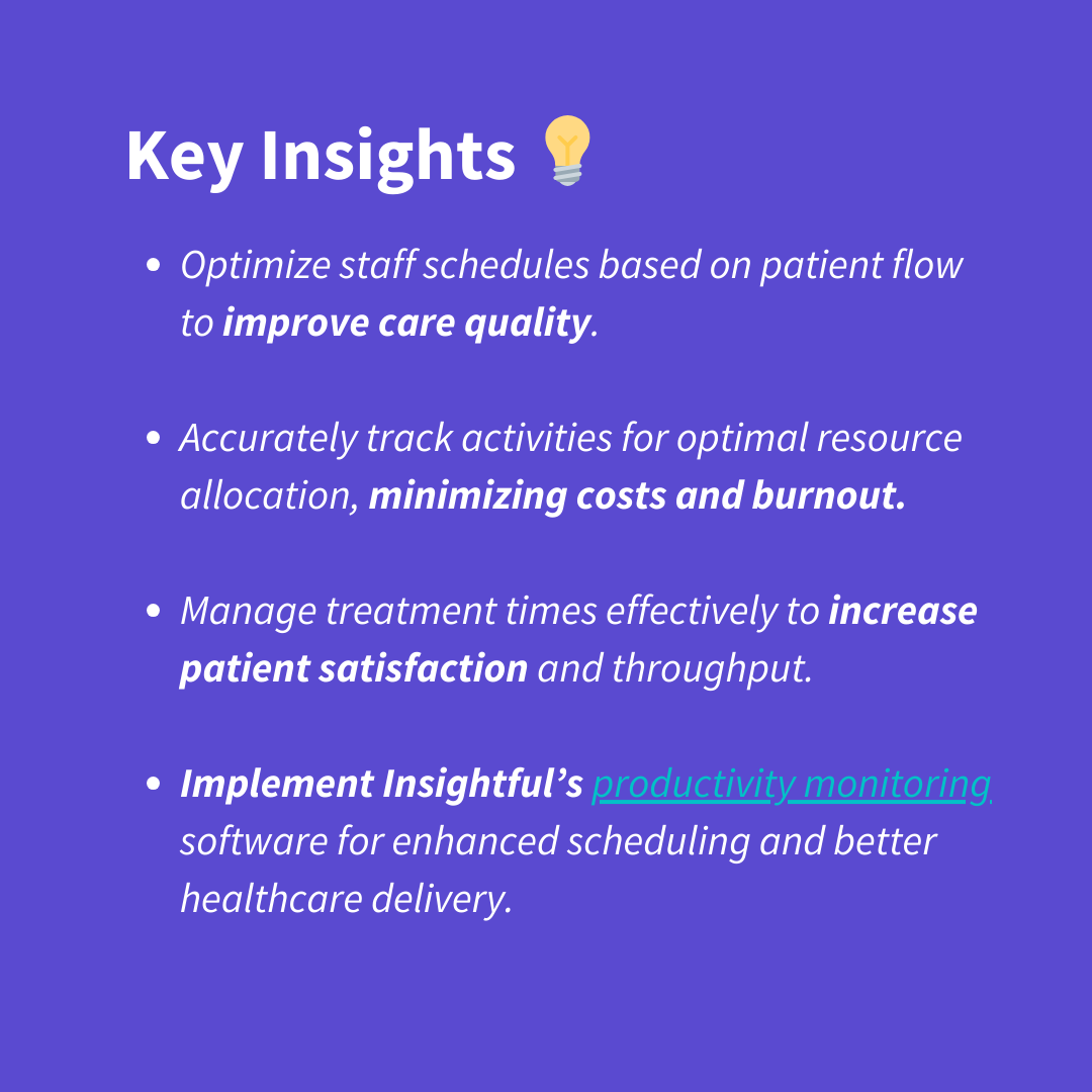 - Mejora de la asignación de recursos y la gestión del personal: Los análisis de Insightful ayudan a ajustar el despliegue de personal y recursos, garantizando que la atención al paciente sea eficaz y eficiente, maximizando la utilización de los recursos sin comprometer la calidad del servicio.
