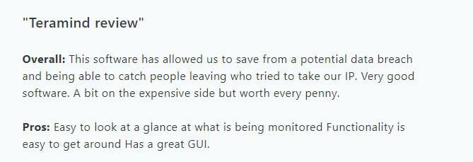 Si bien algunos usuarios se sienten un poco abrumados por la gran cantidad de funciones y, en ocasiones, expresan su preocupación por los cambios inesperados en el precio de determinados informes, en general se considera que Teramind es fácil de usar, tiene un precio razonable y es muy eficaz a la hora de gestionar equipos remotos.