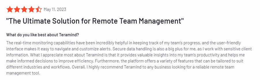 Las opiniones de los usuarios verifican la eficacia de las funciones de Teramind. Las funciones de monitoreo en tiempo real, seguimiento de proyectos y seguimiento de la productividad del software se han ganado los elogios de sus usuarios.