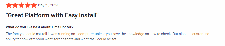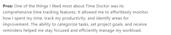 Los comentarios de los usuarios confirman la eficacia de las funciones de Time Doctor. La función de seguimiento en tiempo real de la plataforma, las capacidades de seguimiento de los proyectos y los aspectos relacionados con la supervisión de la productividad han recibido elogios de los usuarios.