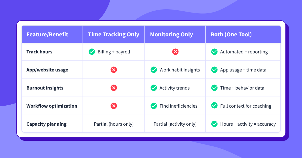 Algunas empresas comienzan con el seguimiento del tiempo y pronto se dan cuenta de que carecen de contexto para esas horas. Otras comienzan con algo básico aplicación de seguimiento de empleados pero necesitan registros claros y responsables para la nómina o la facturación de los clientes. En muchos casos, el enfoque más eficiente es combinar ambos.