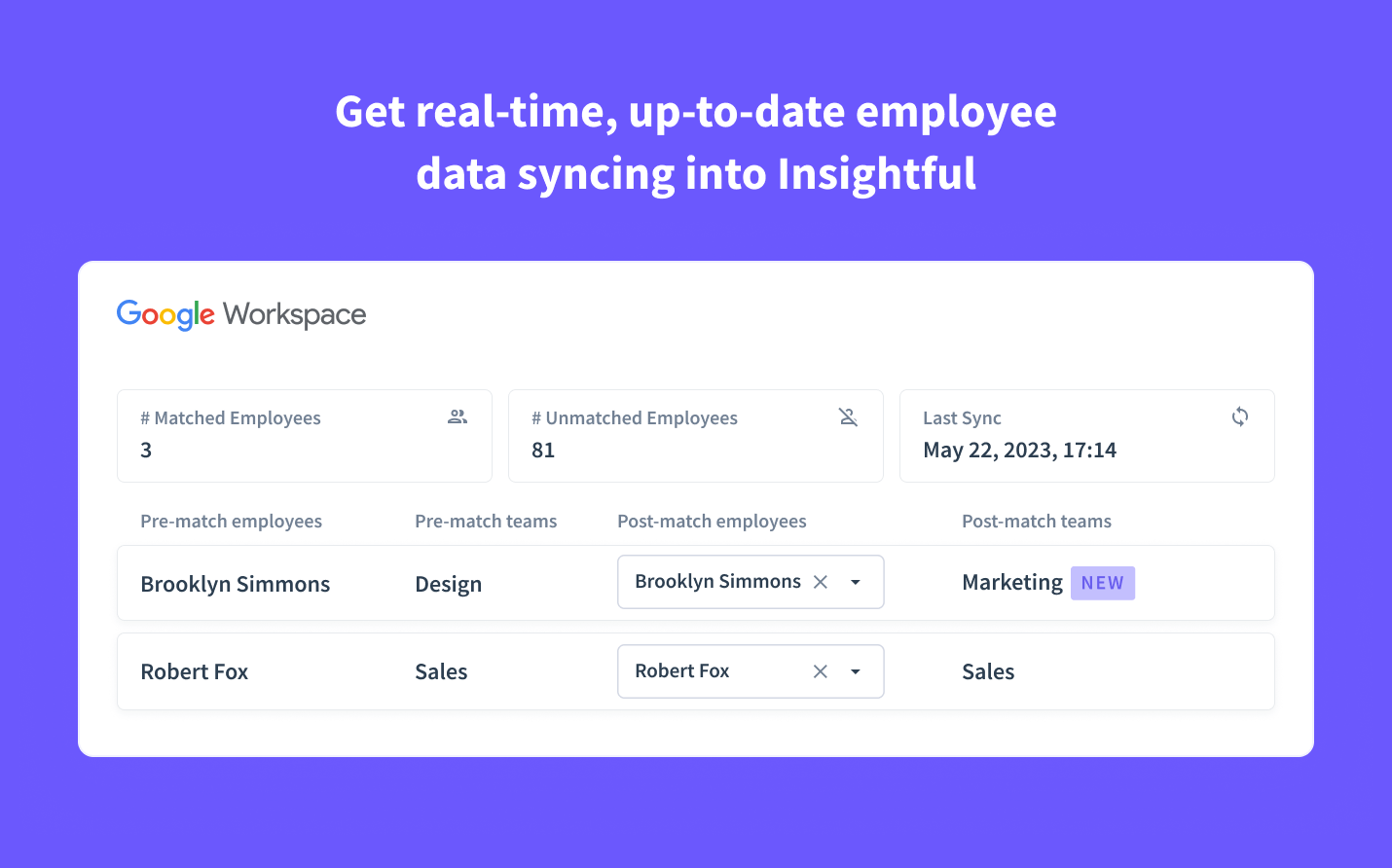 Insightful se actualizará al instante para reflejar cualquier cambio que realices en Google Workspace para facilitar la incorporación.