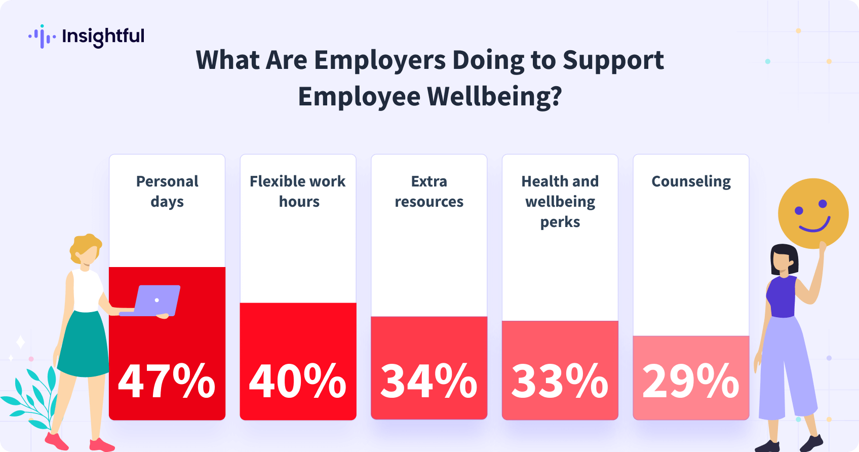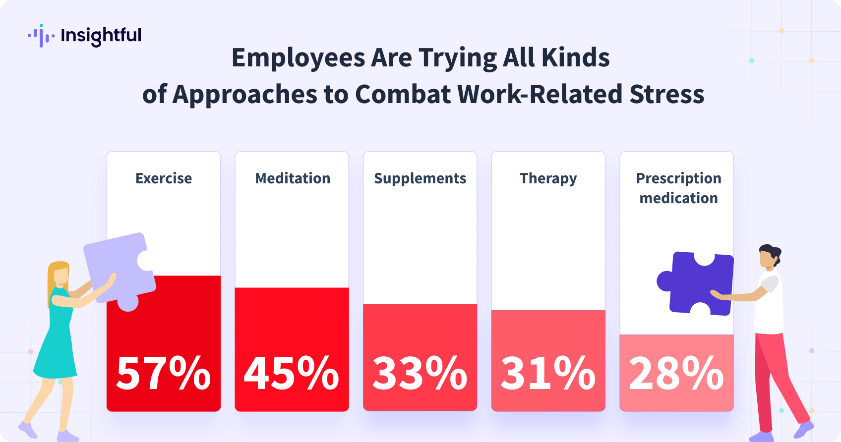 Como señala nuestra investigación, el estrés es más generalizado que nunca en el lugar de trabajo. A pesar de la creciente disponibilidad de beneficios de bienestar, como mesas de futbolín, días de pizza y programas de bienestar, los niveles de estrés en el lugar de trabajo siguen aumentando. El 68% de los empleados se sintieron agotados el año pasado a pesar de estas iniciativas de bienestar, y el estrés sigue alterando la productividad y la concentración.