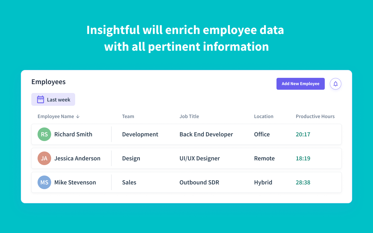 This Insightful integration for HiBob automatically syncs and enriches your employee HR data, then assigns employees to their respective teams.