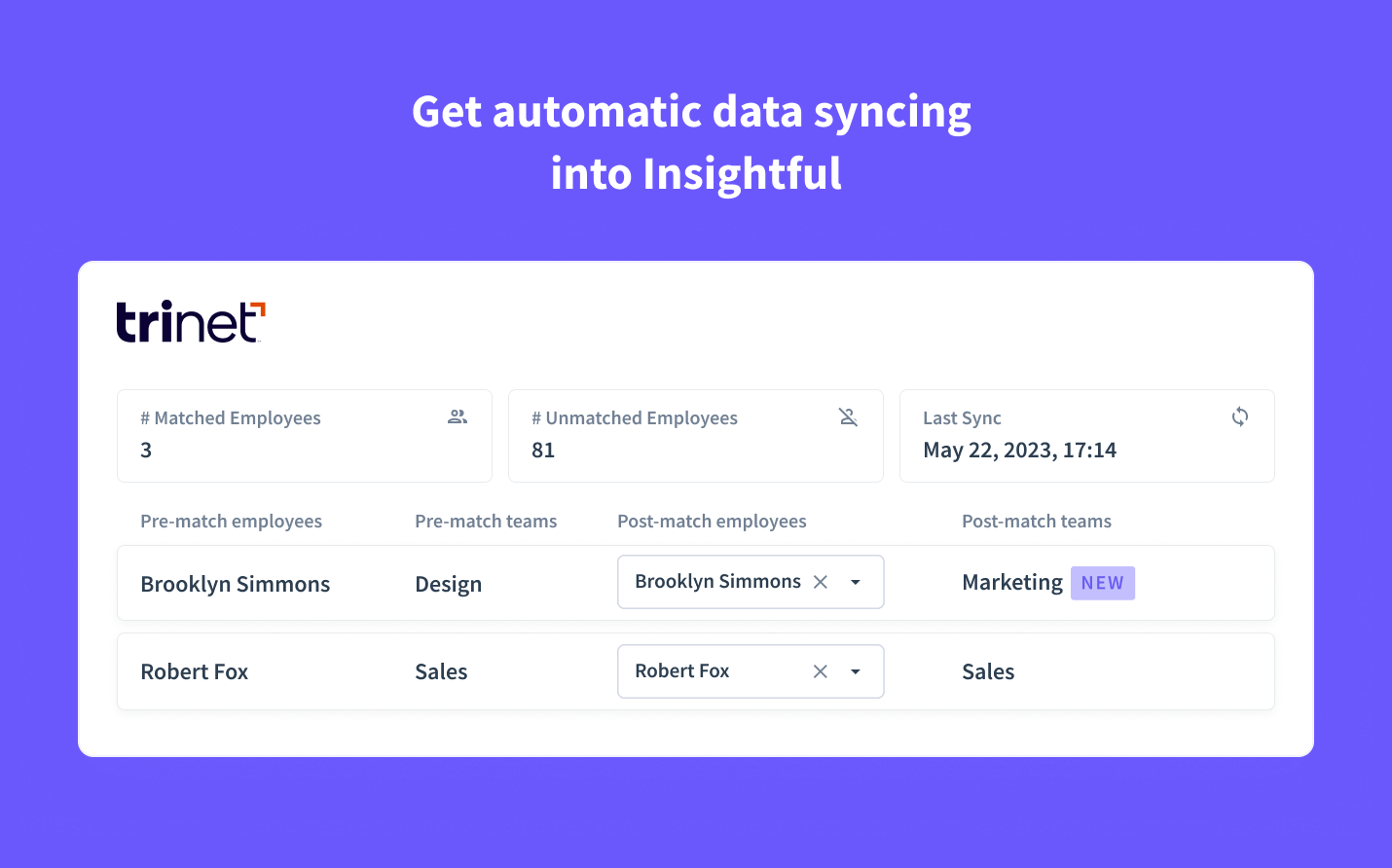 This Insightful integration automatically syncs data from TriNet, enriches it, and assigns employees to their respective teams.